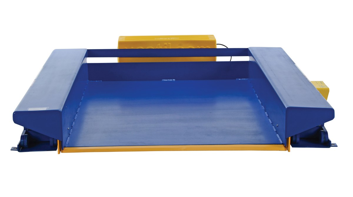 The ground lift scissor table is designed for use when fork trucks are not available. The pallets can be loaded onto the platform with pallet trucks and raised to an ergonomic working height. The safety features include an entry-side electric toe guard to protect pinch points during lowering of the table, velocity fuse to maintain platform height in the event of a hose or fitting failure, foot control, maintenance prop, and upper travel limit switch to stop the table at maximum height and reduce motor wear. The motor is totally enclosed standard with additional voltage options available. The remote power unit can be located up to eight (8) feet away from the table. Optional accordion skirting is available.