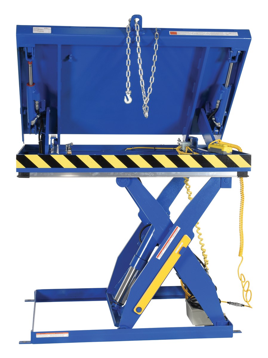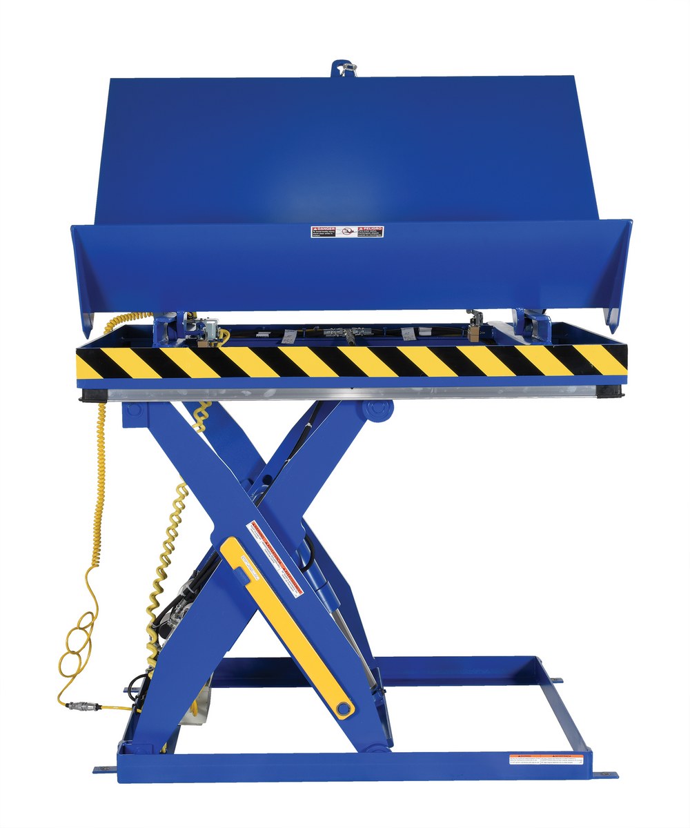 The lift and tilt scissor lift performs both lifting and tilting operations. There is a restraining chain and lip to keep the load in place during tilting. Safety features include an electric toe guard to protect workers from pinch points during lowering of the table, velocity fuses to hold platform position in the event of a hose or fitting failure, four (4) push-button hand pendent control, upper limit switch to stop travel at maximum height and reduce motor wear, and maintenance prop. The end tilt is standard with a side tilt available. There is optional accordion skirting available for both the lifting and tilting portions of the table.