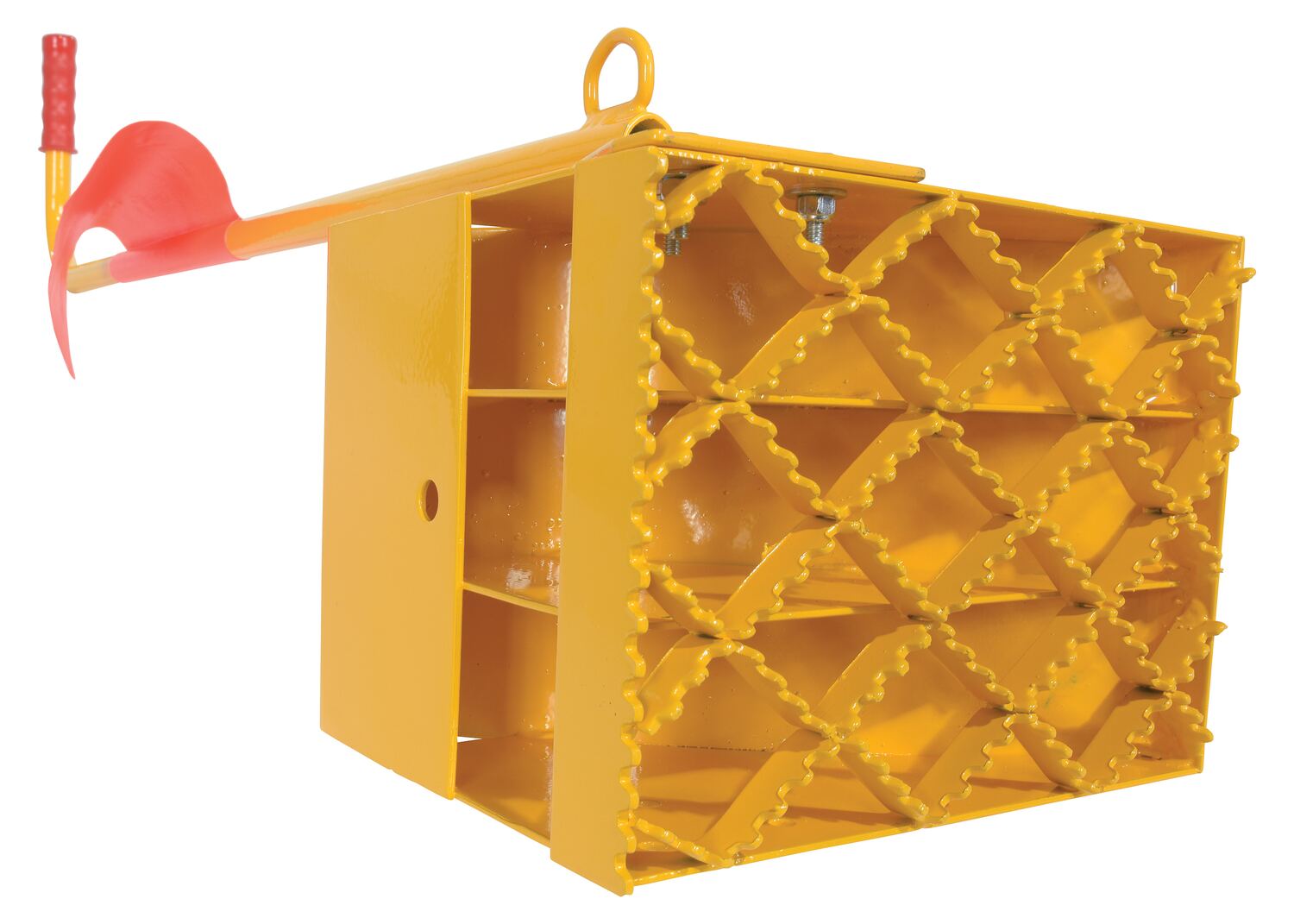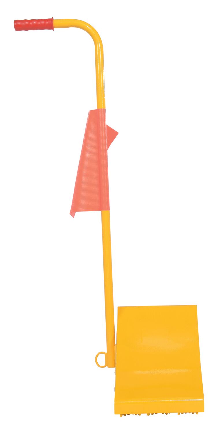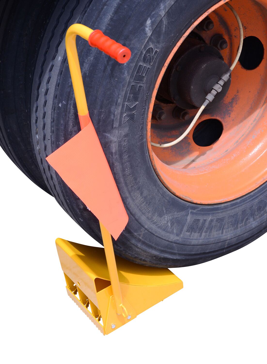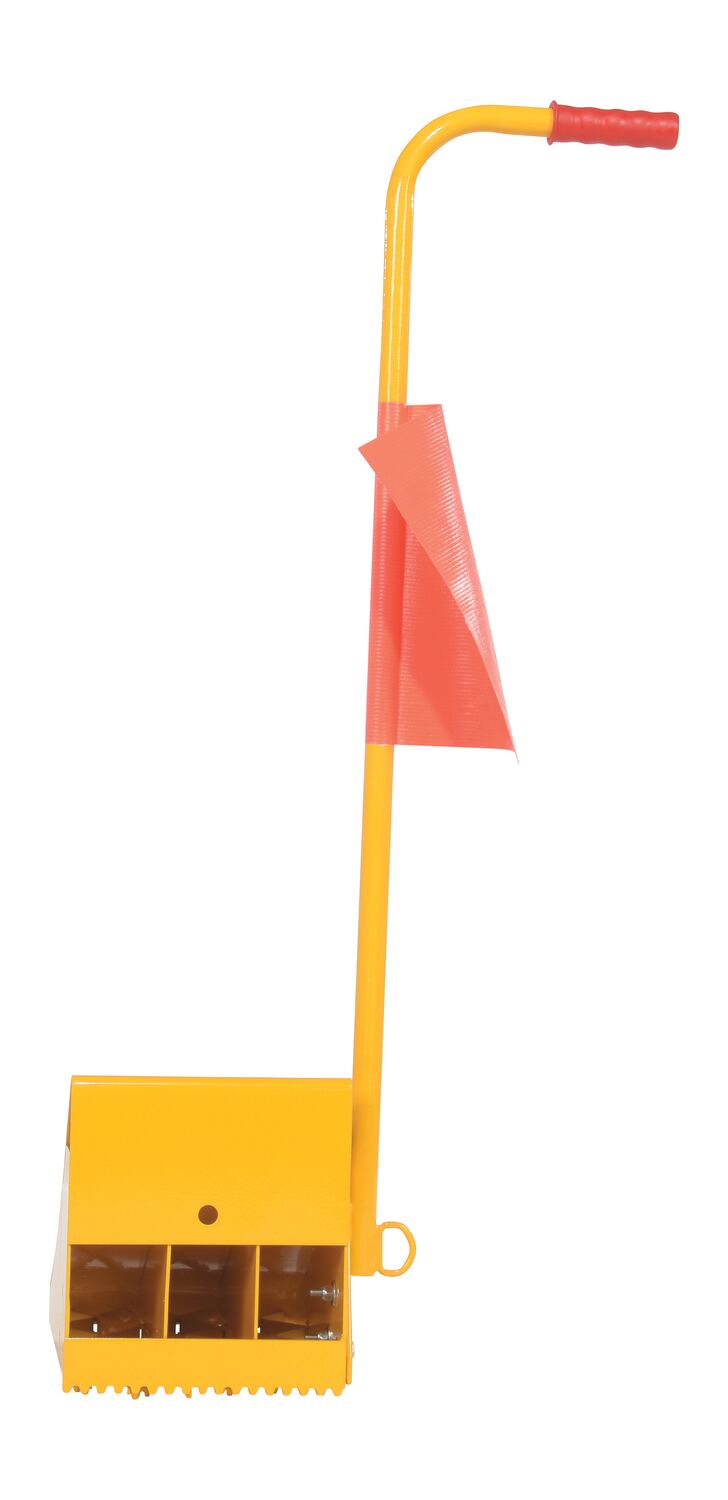 The fabricated ergo-handle Wheel Chock has an ergonomically design that makes it easy to move wheel chocks in and out of position under trailer wheels. It reduces the risk of back, knee, and foot injuries. The handle is constructed of steel and includes a yellow powder coat finish. Assembly required. D-ring provided for attaching security chain. A vinyl flag is included to provide added visibility and awareness to the chock. Chain not included.