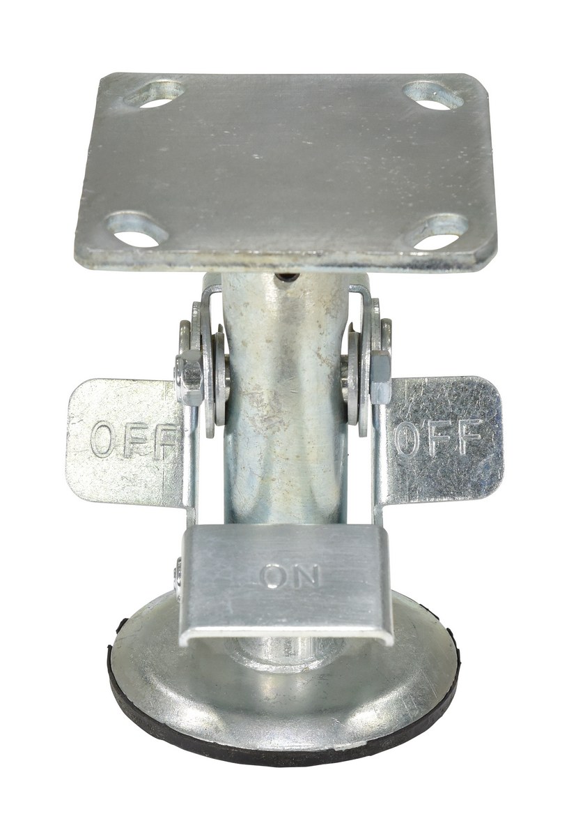 Steel Top Mount Floor Lock 6 to 7 In. Height SilverFloor locks may be used on platform trucks, fixture dollies, or equipment with casters. Simple foot pressure immobilizes equipment. Locks when large friction face is pressed against the floor. To release simply kick release rod. Brake is independent of casters and can be installed to any convenient location on the cart. Vertical mounting plate designed to mount to sides of carts and other portable products. The spring loaded pad accommodates uneven floors. Units mount with pad 1." off the floor when retracted.