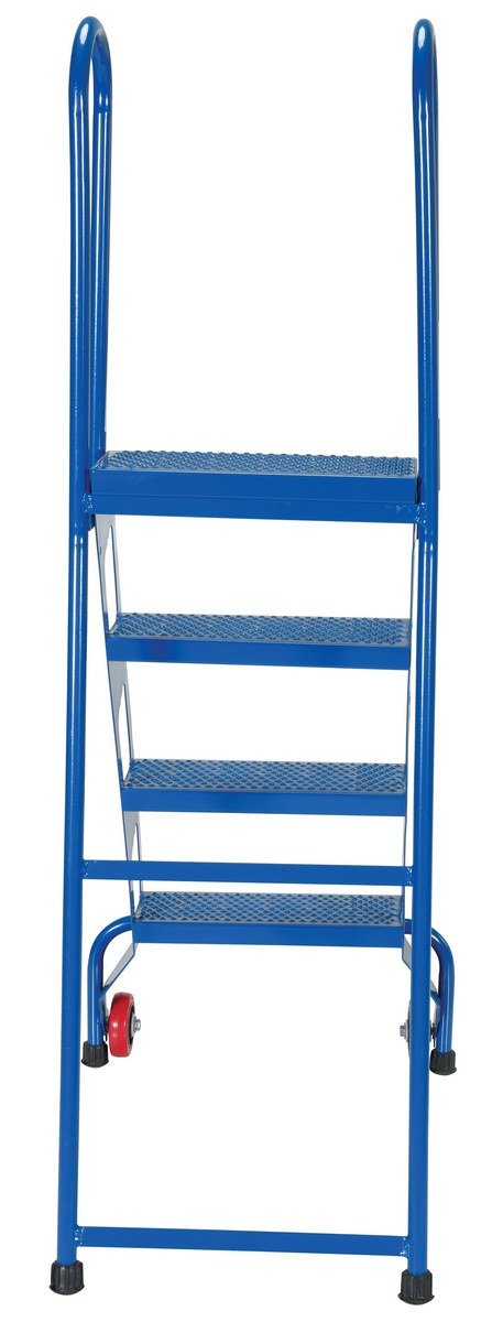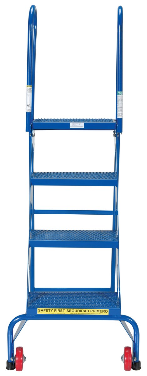 Steel Folding Ladder with Wheels 4 Step 350 Lb. Capacity BlueThe folding ladder with wheels has a locking foldable design that saves on storage space when ladder is not in use. Ladder folds after unlocking spring-loaded detent pin. Once unit is folded, tilt back on wheels for easy portability. Ladder is carbon steel. The steps are perforated to provide a non-slip surface.