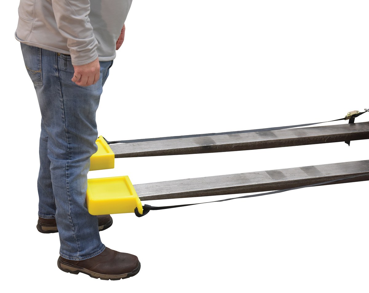 Thick Polyurethane Fork Tip Protector 5-5/8 In. x 3/4 In. Fork Pocket YellowThe fork tip protector is a quick and easy way to make forks safer in a variety of work environments. A durable construction is lightweight and compact for simple storage when not in use. The included nylon strap allows the user to secure the protector in place, for limited jostling during movement. Units are available in a thick and thin outer shell design. Fork tip protectors are sold in pairs.