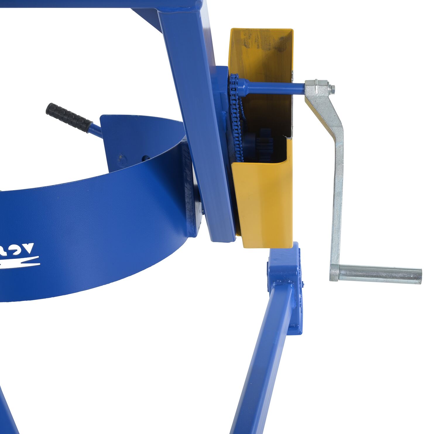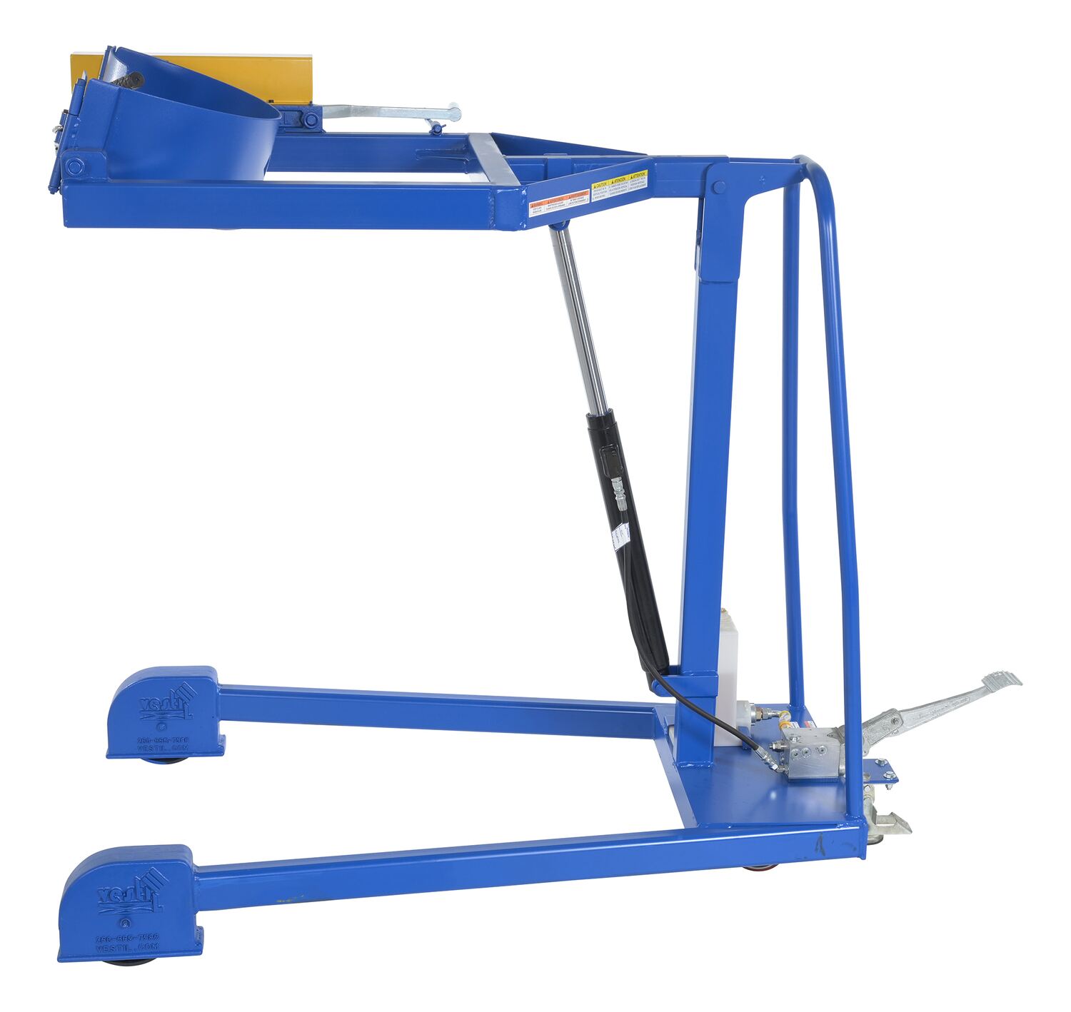 Steel Portable Hydraulic Drum Carrier, Rotator and Boom 71-1/4 In. Lift Height 800 Lb. Capacity Blue / YellowThe portable Hydraulic drum carrier/rotator/boom allows one person to lift, transport, and dispense fully loaded steel drums with ease. It features a manual foot pump hydraulic lift and rolls on casters and wheels. This unit has a chain rotation to rotate the drum. This unit features a lifting boom attachment which stores on the outriggers.