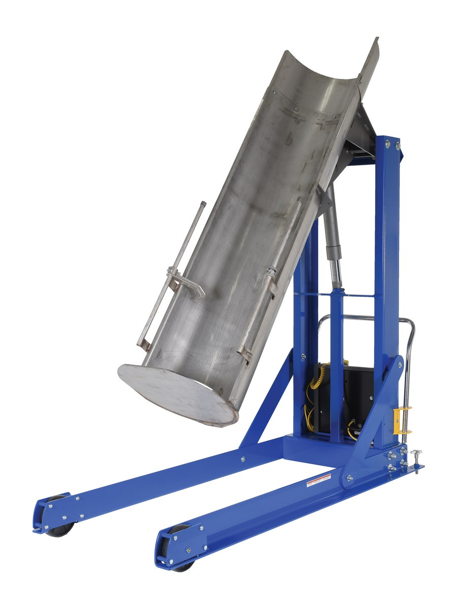 Stainless Steel Portable Hydraulic Drum Dumper 72 In. Dump Height 750 Lb. Capacity Blue/SilverThe Hydraulic drum dumper is what you need to dump heavy drums. Works with plastic, steel, and fiber drums. Dumper has a solid steel chute. this portable unit has casters with floor lock screws. All steel construction. Upper travel limit switch, emergency brass safety velocity fuse in cylinder, and vertical adjustment drum restraints are standard. Dumper is operated with a hand held control on a coil cord standard.