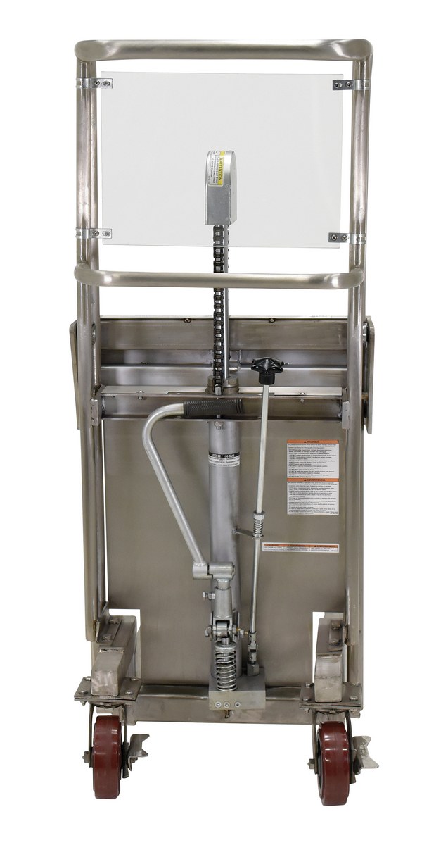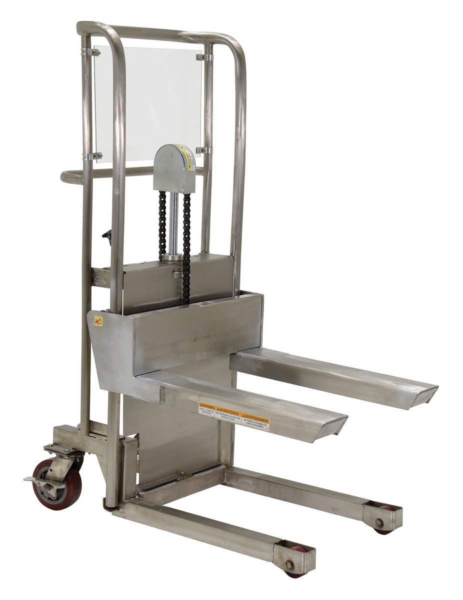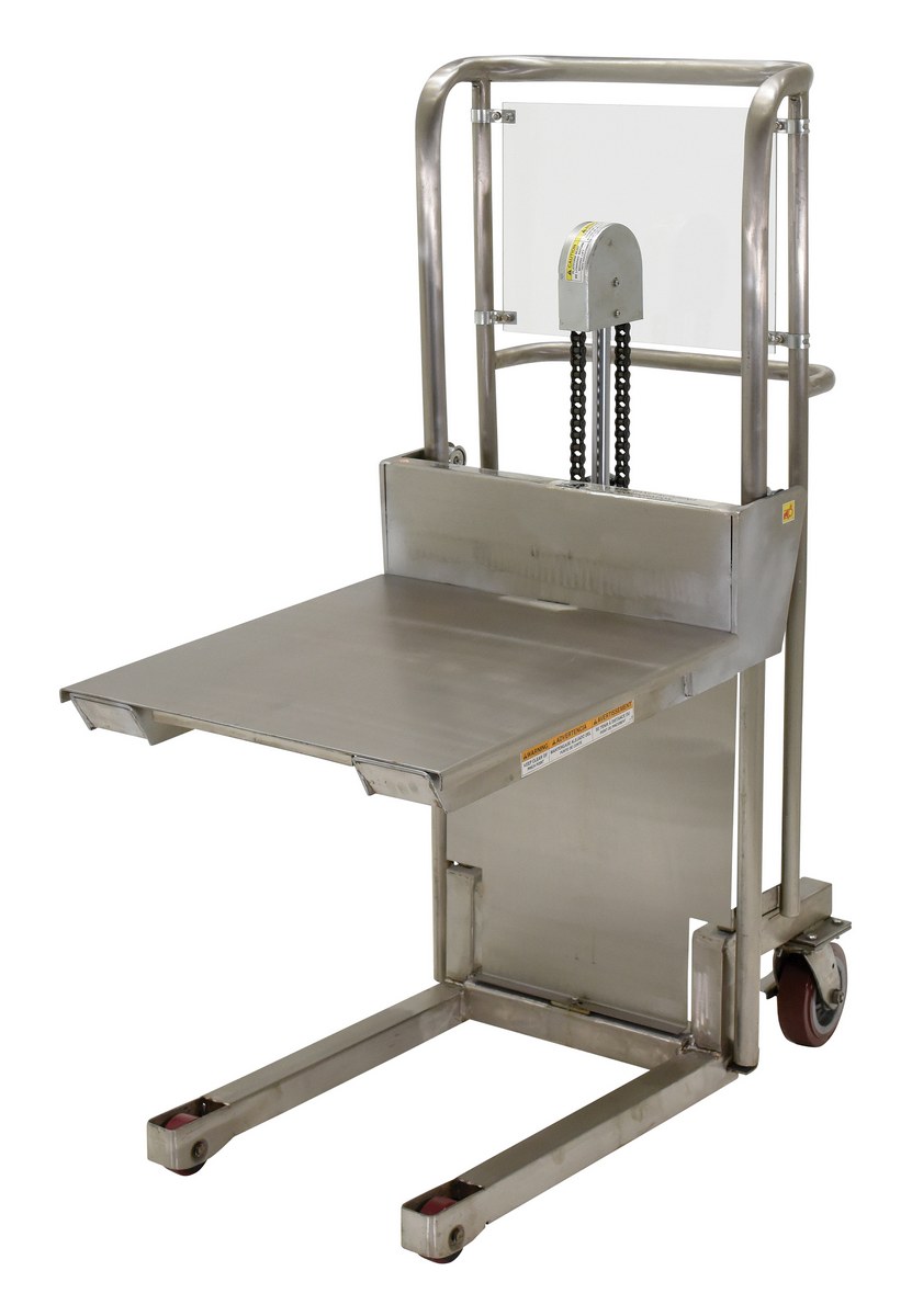 The Hefti-Lift is a user friendly, stainless steel portable hydraulic lift. The lift provides reliable, power lifting when moving and positioning loads. The non-slip chain is used for accurate positioning while the unit rolls easily on two rigid and two swivel poly-on-steel casters that includes a foot operated brake. The lift is all welded construction and not for use with pallets.