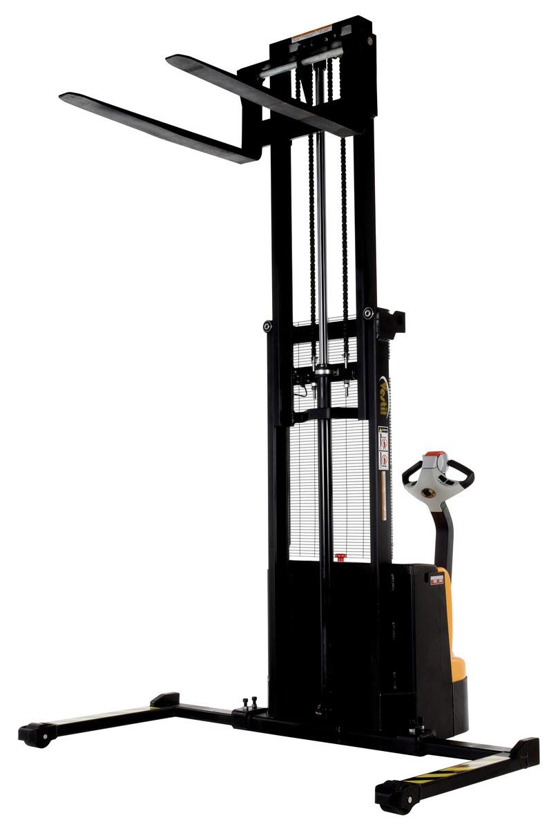 Double mast fully powered electric stacker transports loads throughout warehouse facilities quickly and with less effort. High torque drive and lift motor handles heavy-duty jobs. Ergonomic handle features easy-to-operate throttle with infinite adjustment of forward and reverse speeds, lift/lower controls, proprietary safety-enhancing emergency reverse function, and horn. Includes an electromagnetic disc brake with automatic dead-man feature that activates when user releases the handle. Powered lifter has two lead acid deep cycle batteries, A battery charger, gauge and horn are included . stacker rolls smoothly on poly-on-steel steer and load wheels. 3-4 hour operation at full charge - 8 hours when used intermittently.