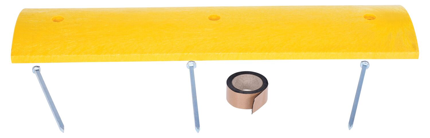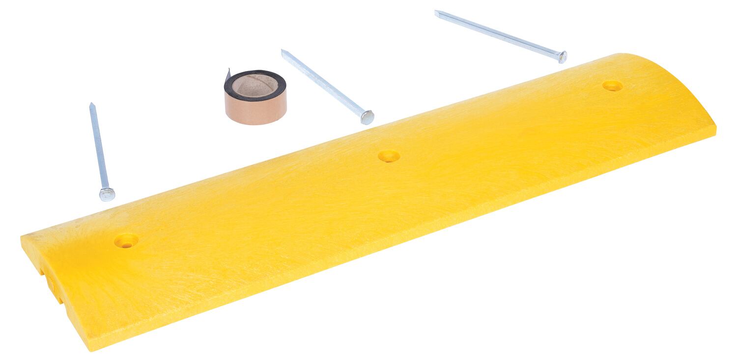 Plastic Speed Bump Asphalt Hardware 48 In. x 12 In. x 2-1/4 In. YellowThe speed bump is ideal for a variety of parking areas, both inside and out. The speed bump helps to control drivers from injuring people and property. The unit can be installed/removed by one person resulting in smooth portability. The strong recycled plastic construction can be used where traffic is frequent and can hold up to the constant day to day harm from chemicals and sunlight. Features a dual cable channel. The HD asphalt kit includes anchors, bolts and washers. The HD anchor should be epoxied (epoxy not included) into the ground and then the speed bump is secured to that anchor with a bolt and washer.