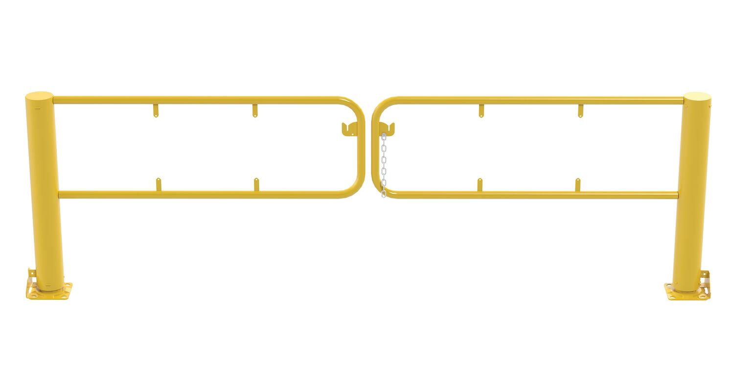 Swivel dock gates are ideal for securing loading docks, parking lots, or other pathways. The gate features a steel construction for durability and a yellow powder coat finish for clear visibility. A chain and chain slots are provided on the ends of the gate arms for securing the gate in the close position, for added safety. Four built-in tabs are included on each gate (eight tabs per pair). These tabs allow a sign to be attached and secured in place between the upper and lower bars of the gate. The open design makes it easy for single or double sided signs to be utilized. Standard and custom sign designs are available separately.