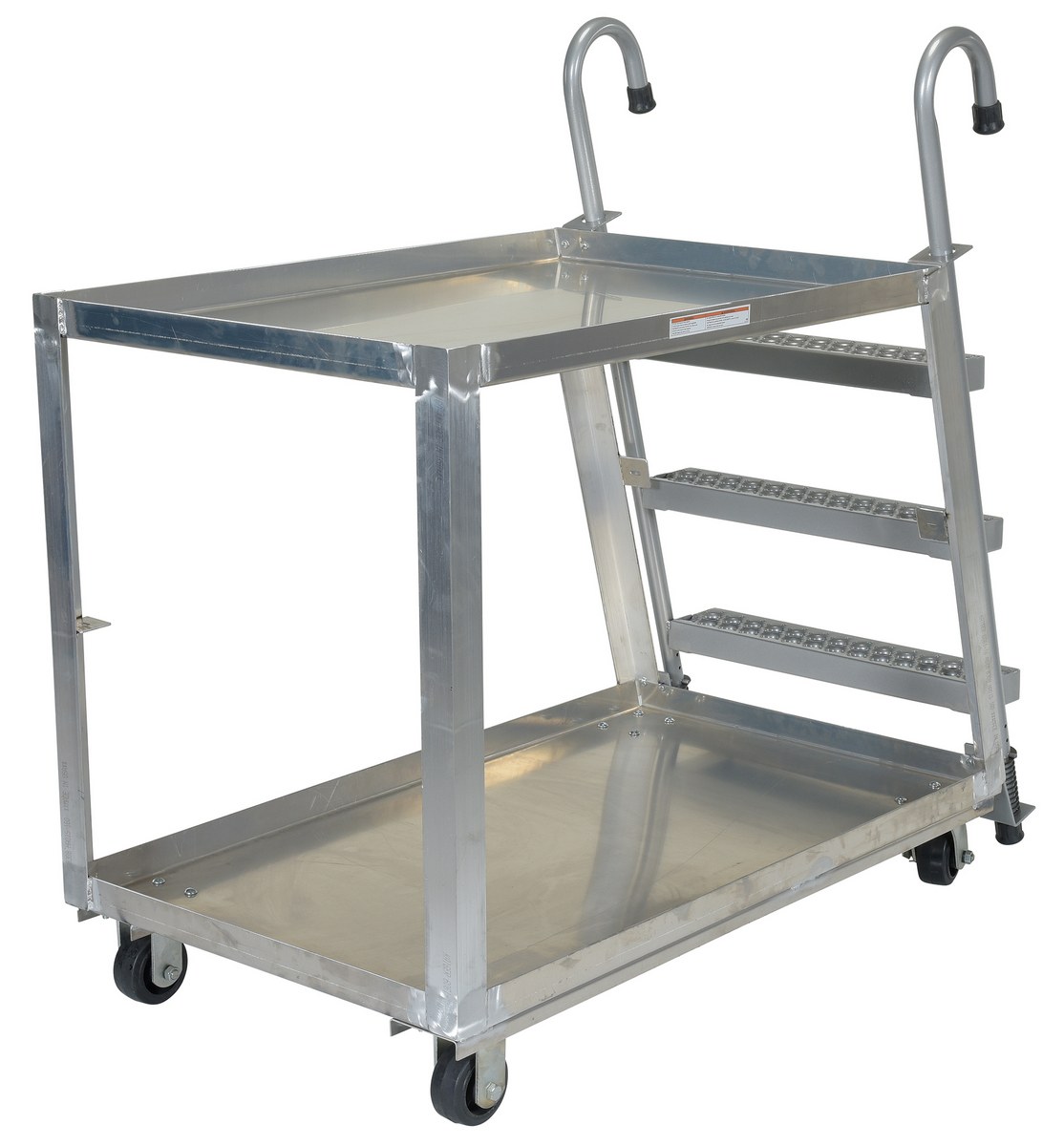 Combine the mobility of a cart with the versatility of a step ladder with this stock picker truck. Convenient spring loaded steel step ladder holds the cart securely in place while a person is standing on the ladder. Crutch tip ladder prevents the cart from moving while stocking. Springs then return the ladder to the raised position once personnel exit the step. All shelves have the lip turned up to prevent items from falling off. Ladders have a baked in silver powder coated finish.
