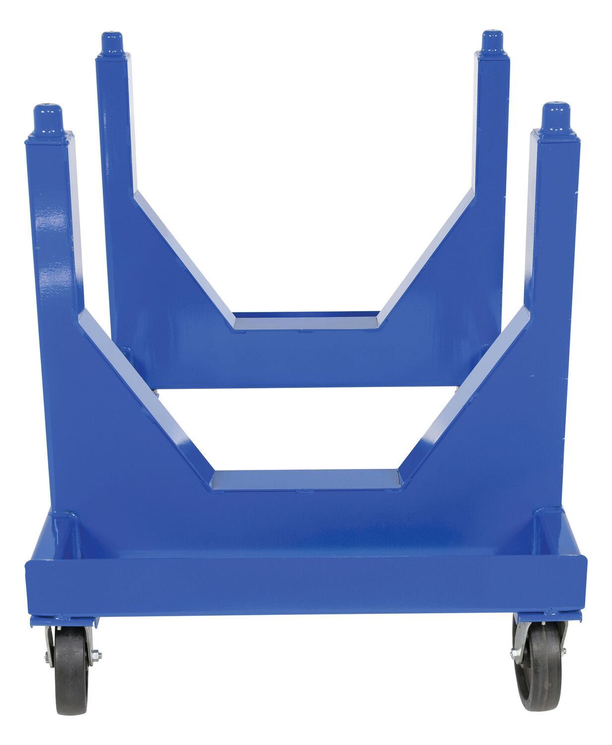 Steel Heavy Duty V Bottom Stackable Material Cart 36 In. x 54 In. x 40 In. 5000 Lb. Capacity BlueA stackable material V-bottom cart provides the same great benefit of a standard material cart, while allowing multiple units to be stacked for a smaller warehouse footprint. A steel platform and structure enables a larger weight capacity of items to be maneuvered in a more efficient time-frame. The V shaped bottom design is perfect for pipe and other cylinder shaped items. The surface is smooth to diminish the chances of abrasion during any possible jostling. The units are stacked together using a simple four corner post design for a more even weight distribution.