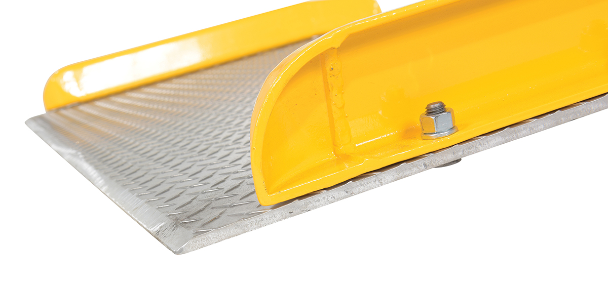The Aluminum truck dock board with steel safety curbs is designed for portability and safety. The deck is made of tough high strength aluminum tread plate. The edges are beveled for smooth entry and exit. Safety curbs are coated yellow and are constructed of steel with cast tapered ends. Steel legs are bolted on for increased durability. Canted locking legs for easier truck portability. Manufactured in compliance with OSHA. The capacity is based upon the heaviest type of equipment used plus the maximum load carried times the single axle rating of total load. Dynamic loading, driver tendencies, speed and frequency of use must be considered. When using three-wheeled fork trucks order dock board with capacity at least four-times the lifting capacity of fork truck. The width of the dock board should be at least fifteen (15) inches wider than the load or equipment passing between the curbs. If the load does not pass between curbs, but is elevated above, add fifteen (15) inches to overall width of equipment.