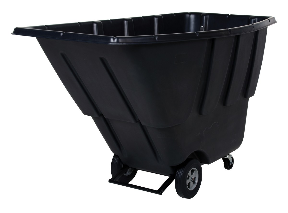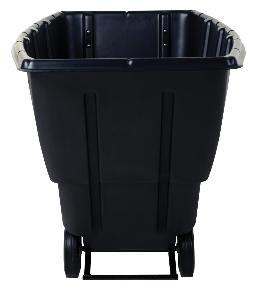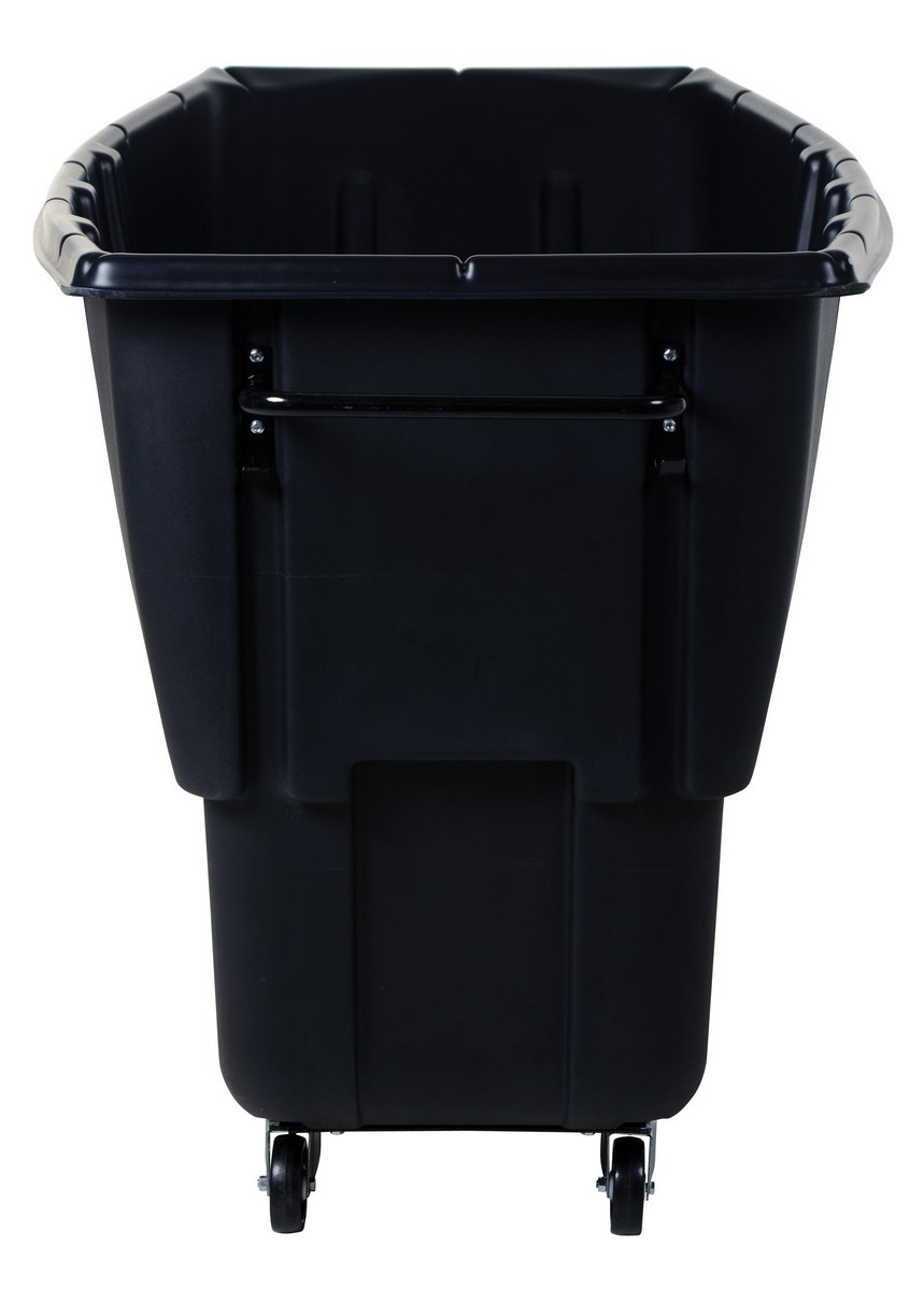 Durable plastic construction allows for collecting waste from multiple bins at a collective time. Great for warehouses, fairs, ball parks, schools, etc. Strong, one-piece molded polyethylene body with steel base tip support and a balanced design to allow for simple dumping by one person. Easily portable on 2 large rubber wheels and two swivel wheels. Not for use with fork trucks. Black color design.