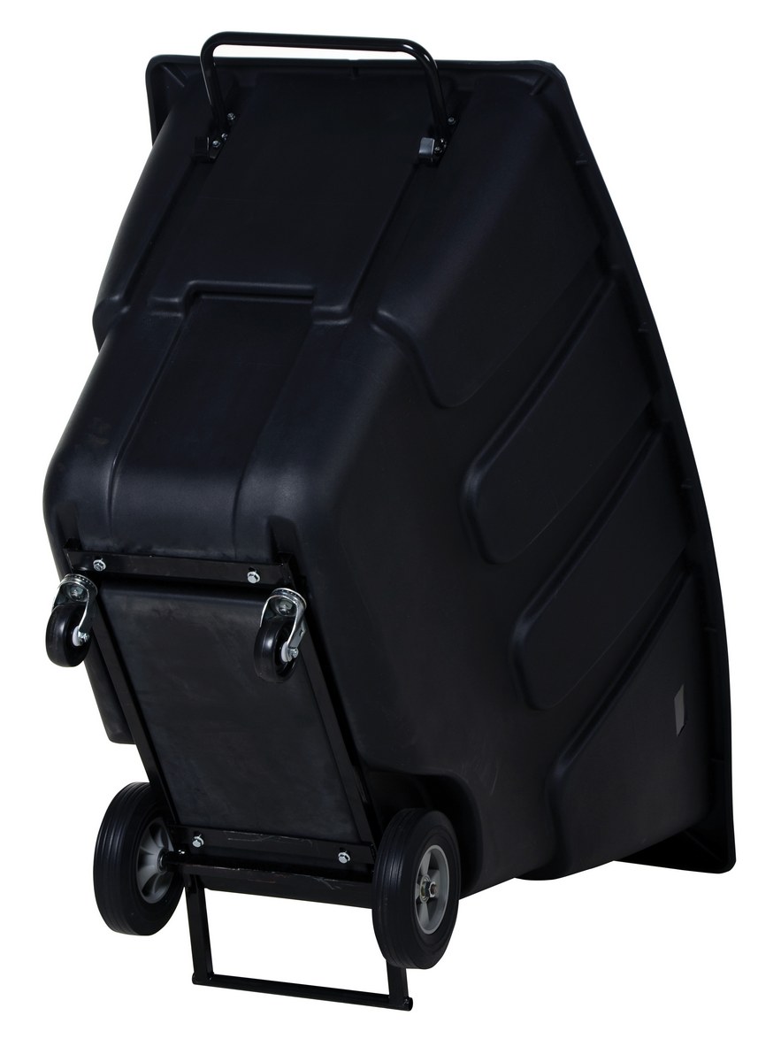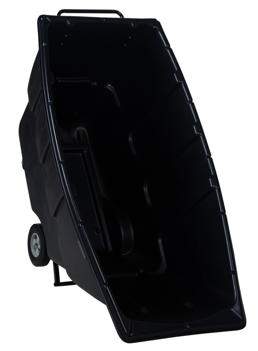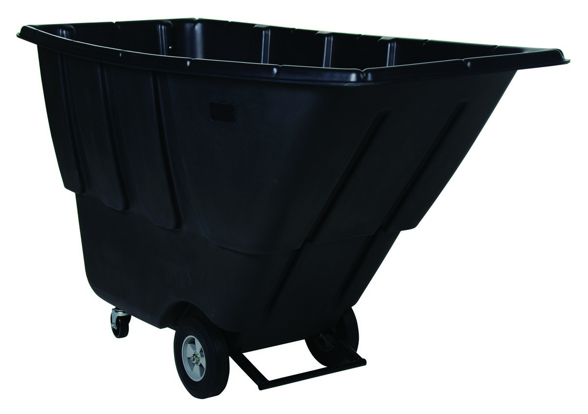 Durable plastic construction allows for collecting waste from multiple bins at a collective time. Great for warehouses, fairs, ball parks, schools, etc. Strong, one-piece molded polyethylene body with steel base tip support and a balanced design to allow for simple dumping by one person. Easily portable on 2 large rubber wheels and two swivel wheels. Not for use with fork trucks. Black color design.