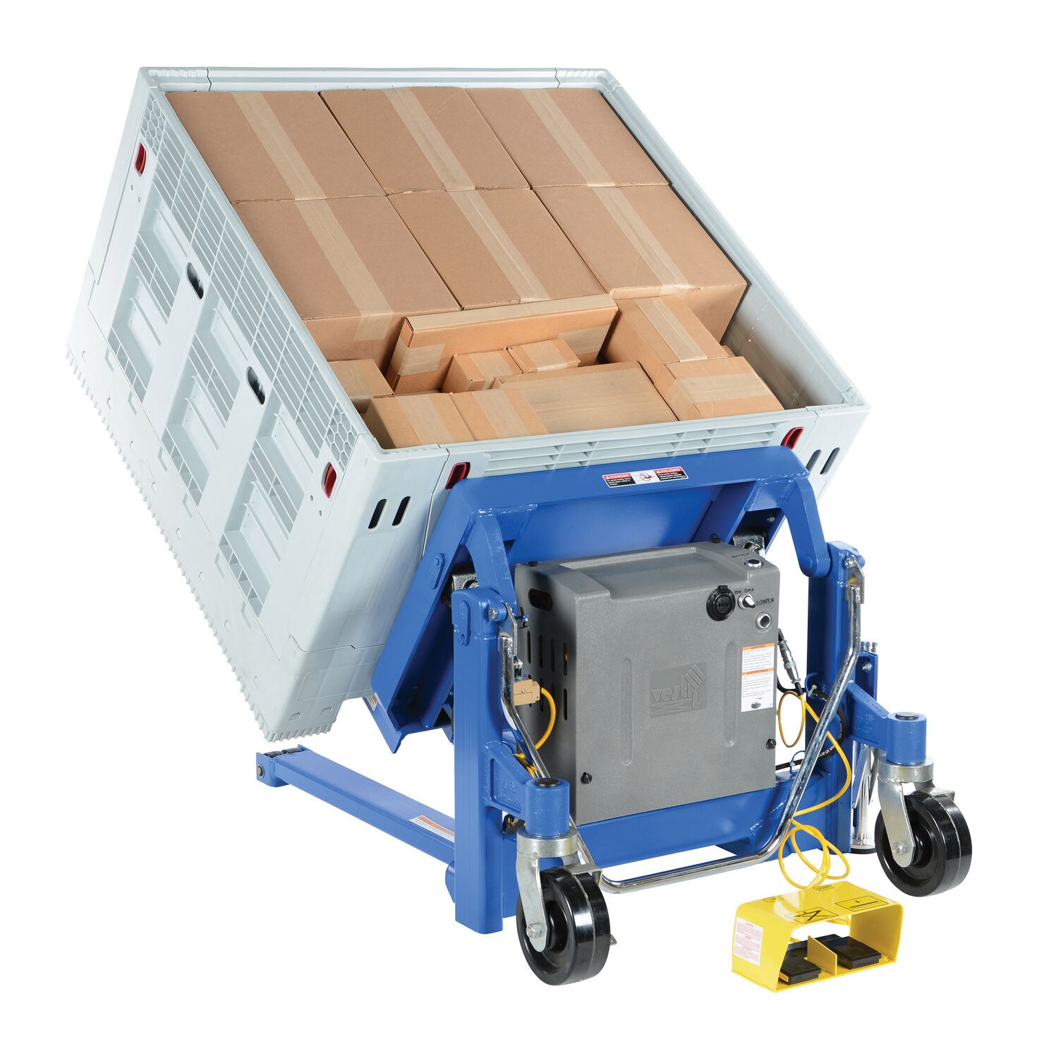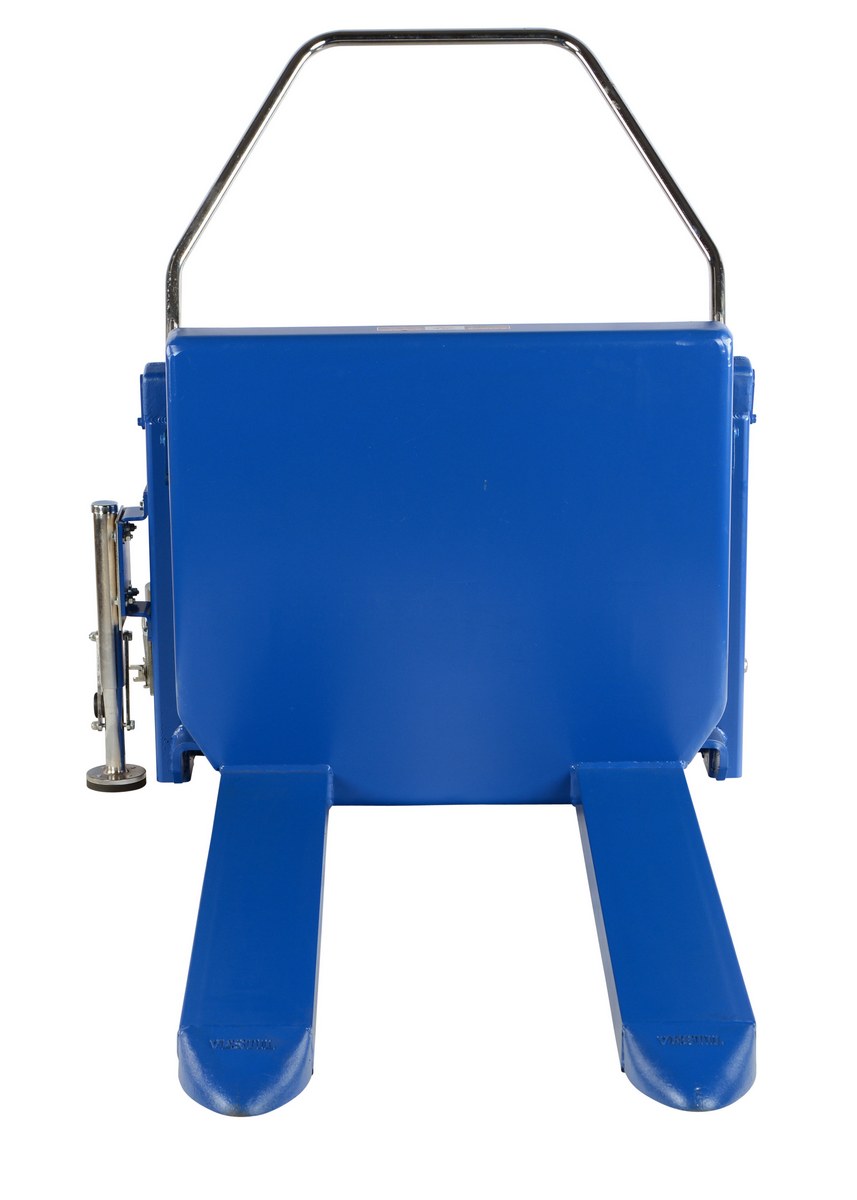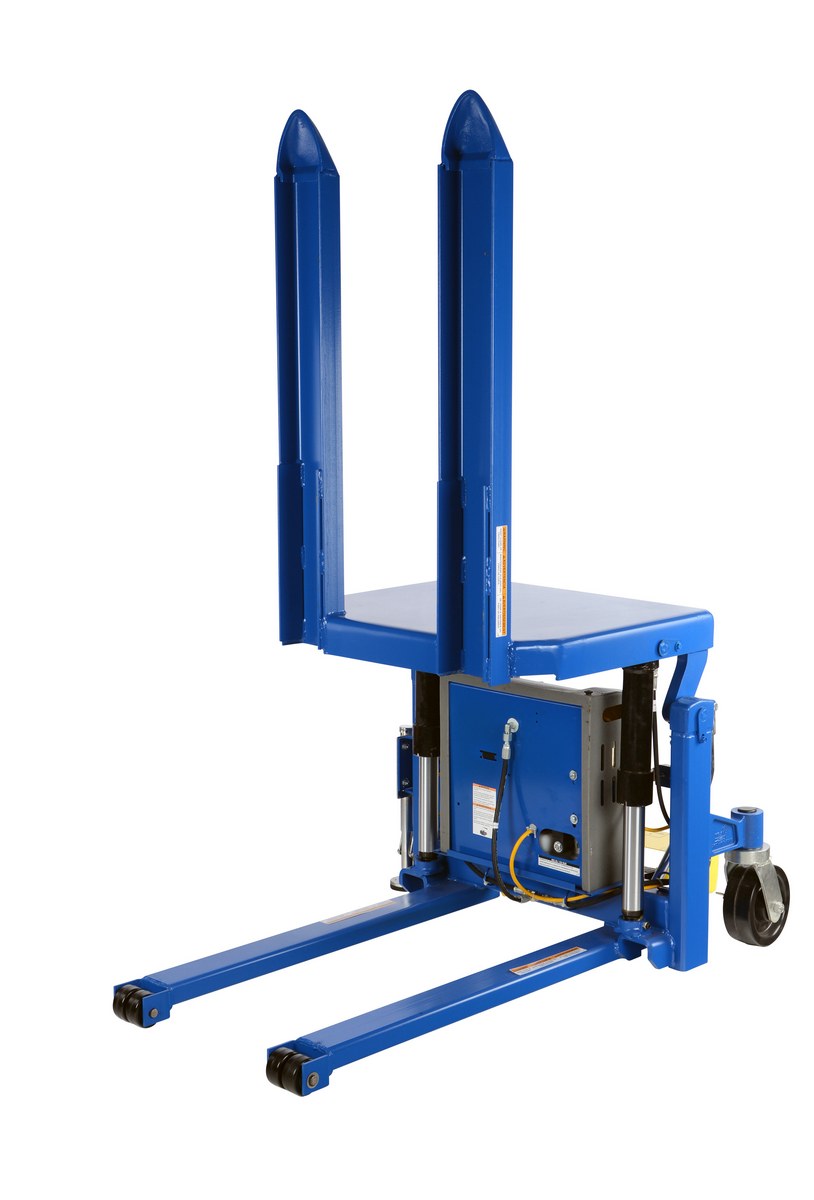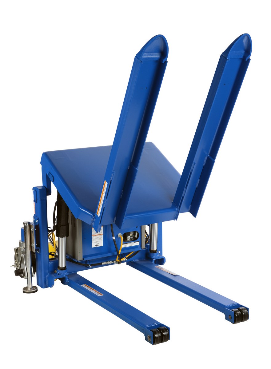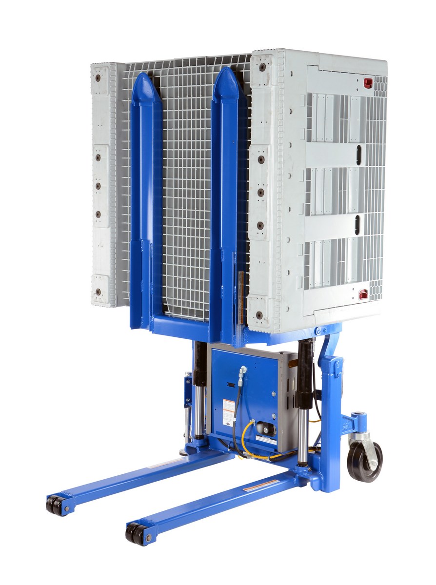 The tilt master lifts and positions filled tote boxes or baskets without the need of a fork truck or lift table using the newly designed heavy-duty tilt master. The tilter will function as transporters by moving completed products from work station to work station without waiting for a fork truck. This lift has a thin profile to allow the user to get as close to the load as possible, has a standard floor lock and rolls easily on the phenolic steering wheels. It is designed to be used with open bottom pallets or skids. The unit is powered by an electric DC motor that includes an on-board battery charger, battery charge indicator gauge and foot control.