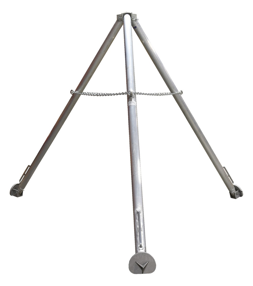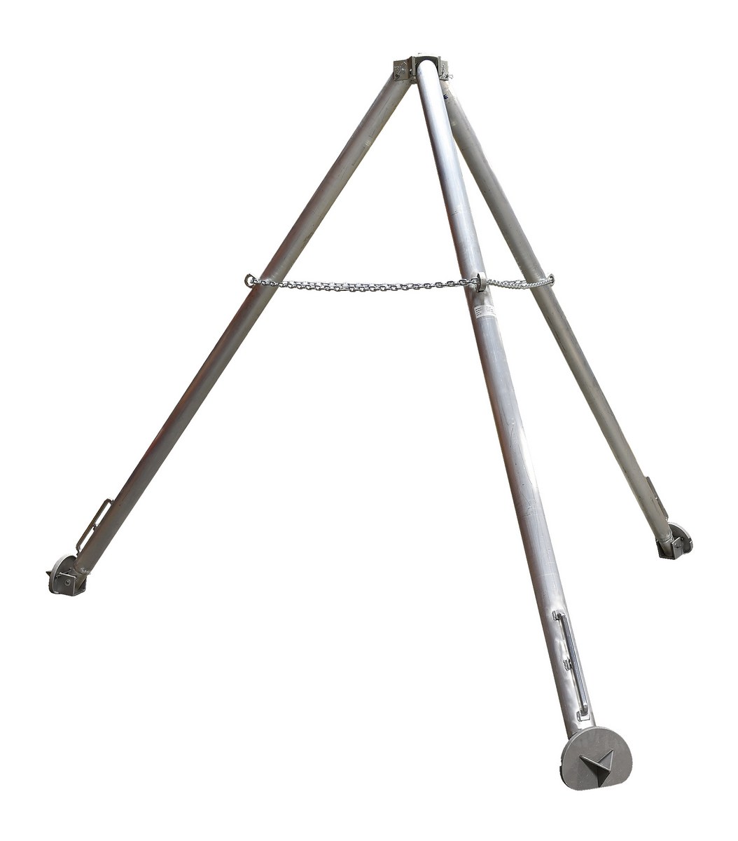 This portable aluminum tripod hoist stand provides a convenient and economical lifting support stand. The unit folds for convenient portability and storage. Great for access to confined spaces. Features padded pivots for smooth or spiked feet. The spiked feet are designed to be used in rough terrain. A swivel eye bolt and safety chain are standard. Chain hoist not included.