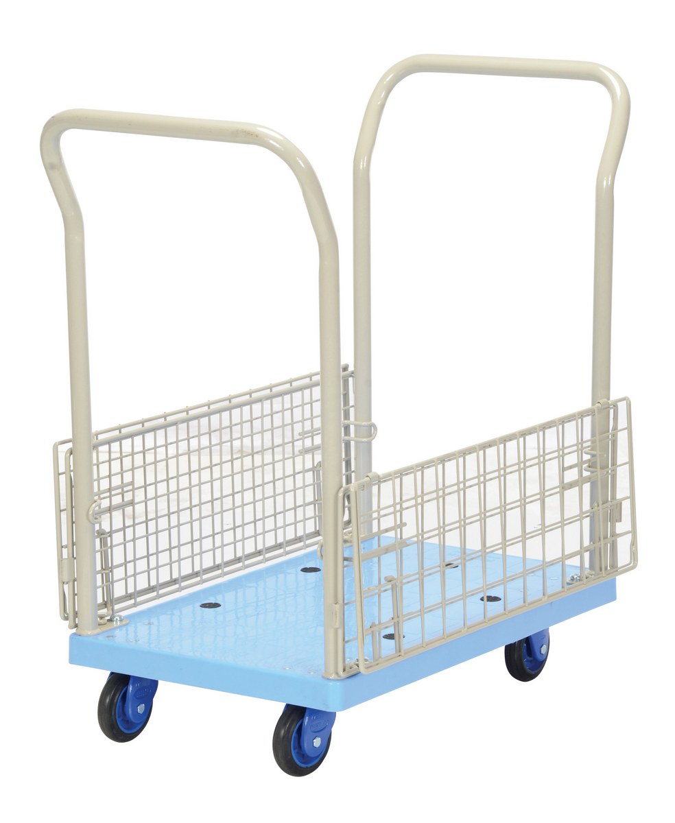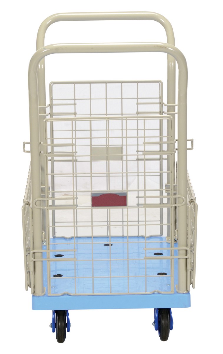Plastic Truck Mesh Sides 32-1/2 In. x 19-1/4 In. x 34 In. 330 Lb. Capacity BlueThe plastic platform cart is a great addition to the shipping and distributing facilities. The plastic platform creates a durable, yet lightweight construction that can be transferred simply from workstation to workstation. The unit rolls on casters for smooth transference over a variety of terrains, while the side nets enable the utmost security. The attached handle creates a more ergonomic posture of personnel during use.