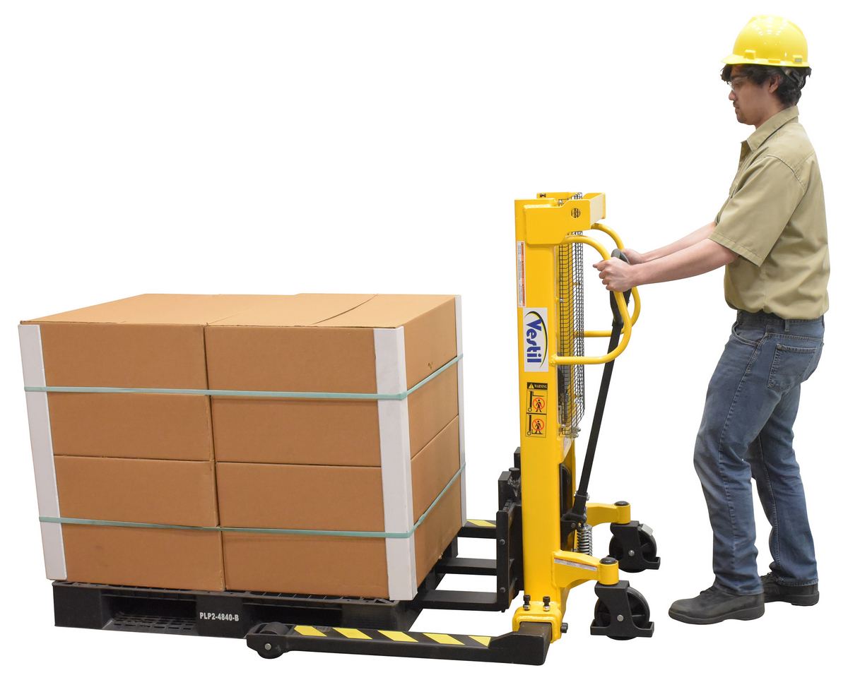 Manual Hydraulic hand pump stackers are sturdy and compact to fit through standard height doors. Forks are raised by manual hydraulic hand pump operation and released by a lever situated on the handle. 1" lift per handle pump. Two rigid and two swivel wheels standard.