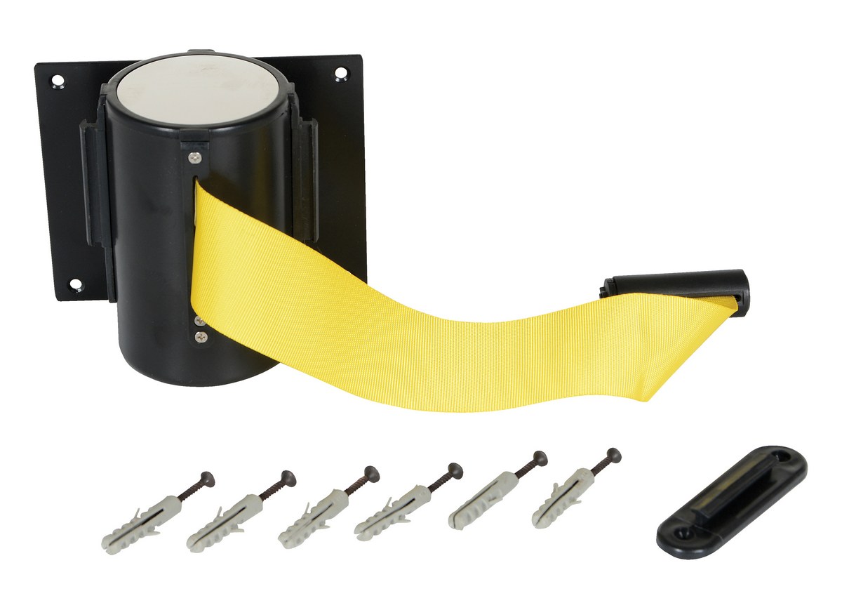 Keep lines flowing smoothly with economical indoor personnel guidance barrier. Perfect for restaurants, offices, hospitals, schools, and banks. Ideal for indoor applications. Series web are not interchangeable with series TSB. This wall mount unit with receptacle includes yellow fabric web. Web end will attach to wall-mounted receiver or another floor-mounted barrier.