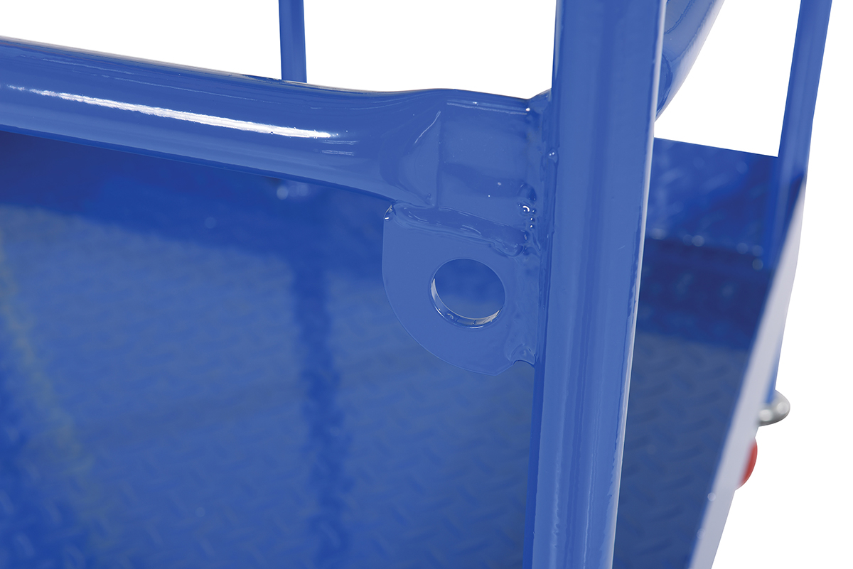 Steel Work Platform With Poly Casters and 84 In. Expanded Back 36 In. x 36 In. 1,000 Lb. Capacity BlueThis convenient fork truck work platform quickly and safely raises maintenance personnel where they are needed. Attaches to fork truck by inserting forks into fork pockets and securing platform to fork truck. Fork locks secure platform to forks. Dual handrails on three (3) sides. Expanded metal backing on fourth side. Includes checker floor plate platform and long strap with hook to attach platform to fork truck. A maximum of two (2) people can be in the work platform at one time. Includes (4) four poly swivel casters. Meets California OSHA specifications.