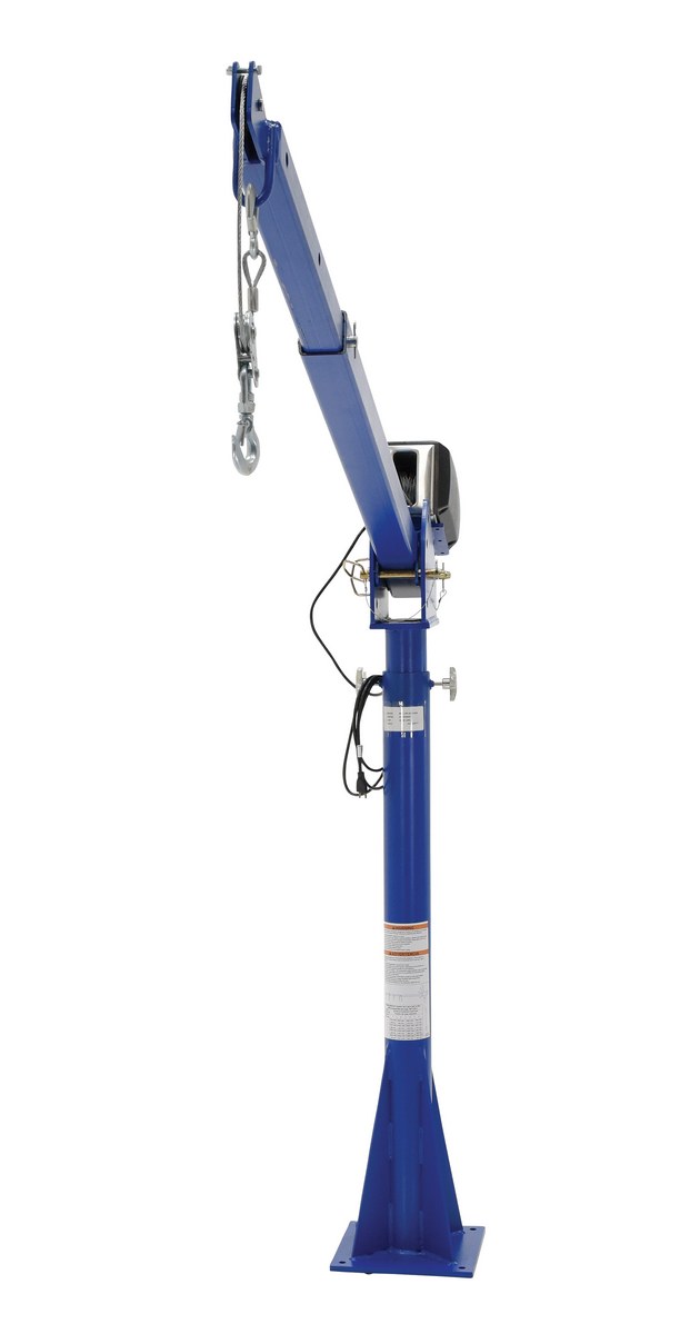 Steel AC Powered Jib Crane CSA Compliant 4-7 Ft. Boom 2,000 Lb. Capacity BlueA power lift Jib crane is designed for material handling applications on docks, in warehouses or in truck beds. This intermittent unit uses crane feature rotation hand brakes that offer unlimited positioning. The mast mounts permanently. Boom adjusts in one (1) foot increments and can be positioned at four (4) elevations. Fingertip switch to raise and lower hook. Folds for storage. Unit is designed for vertical lifting only. Do not use unit for lifting personnel or overhead lifting.